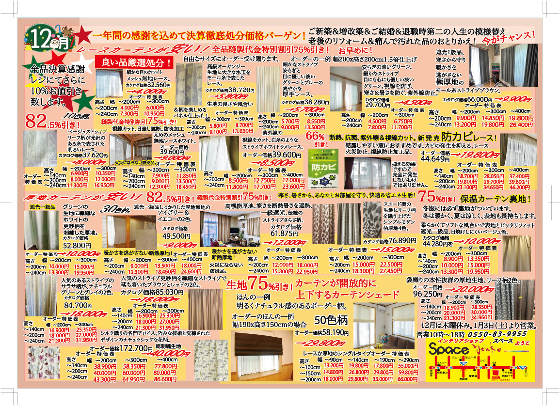 スペースようこでは12月1年間の感謝を込めて決算徹底処分価格バーゲンを開催します。
